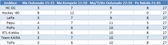 Vuoron johdosta LaPa ja Papu saivat paikan järjestelmästä. Sarjaohjelma on nyt julkaistu. Poikkeuksena siinä on, että Hockey -90:llä ja Papulla ei ole perjantaisin pelejä, koska heillä on oma vuoro samaan aikaan. Lisäksi kerran kuussa pelataan tiistaina ja keskiviikkona. Tiistain peleissä ToPo aina toinen joukkue ja keskiviikkona PoPo. |